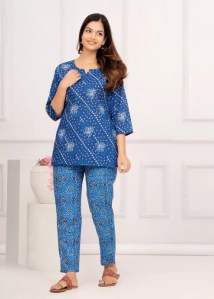 Women Top And Pyjama Set Blue Jaipuri Printed