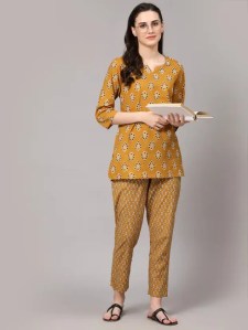 Women Top And Pajama Set Yellow Printed